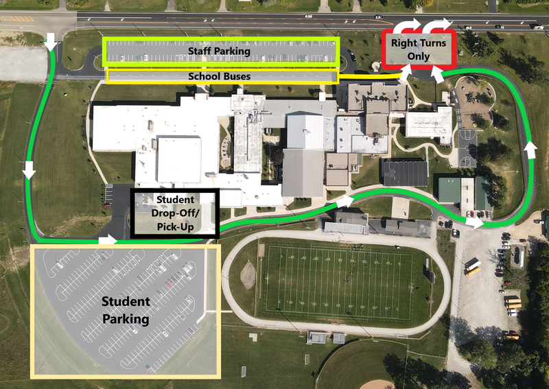 Reminder, starting this year student Drop-Off and Pick-Up will be in the back of the school building. During this time, traffic must enter through the North entrance (boulder), drop off or pick up students at the Hive entrance, and continue to the South exit. Traffic must then turn right when exiting the school onto State Route 201 during the designated times. Student drop-off will take place between 7:15am and 7:40am, and student pick-up will be held between 2:30pm and 2:55pm.