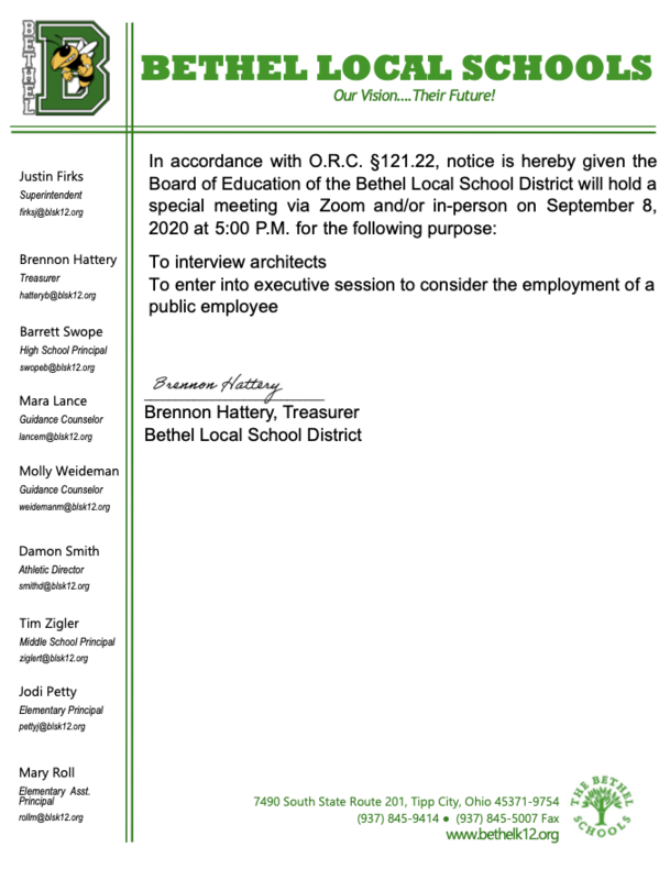 In accordance with O.R.C. §121.22, notice is hereby given the Board of Education of the Bethel Local School District will hold a special meeting via Zoom and/or in-person on September 8, 2020 at 5:00 P.M. for the following purpose: