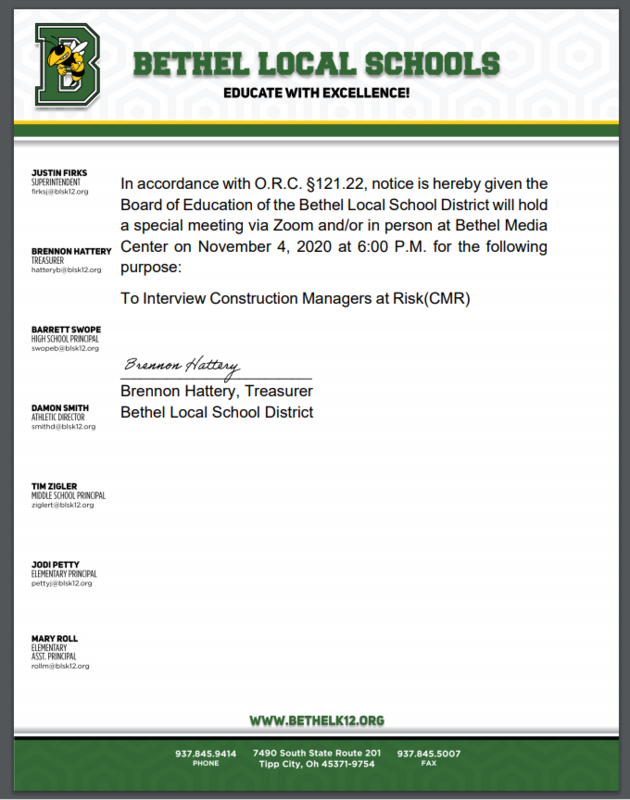 The Bethel Board of Education will be having a special meeting on November 4, 2020 at 6:00 PM to conduct interviews of Construction at Risk Managers.